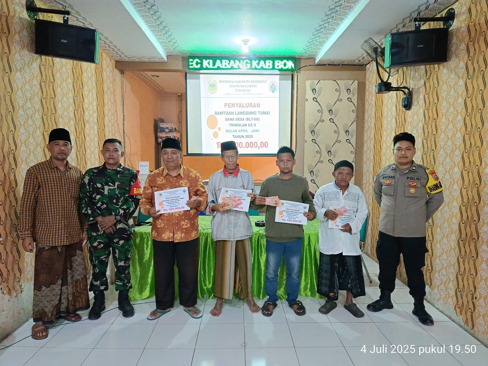 Bondowoso —Pada Jumat (4/7/2025 Malam. harapan menyelimuti Balai Desa Besuk, Kecamatan Klabang.Sebanyak 32 warga penerima manfaat tampak antusias saat Bantuan Langsung Tunai Dana Desa (BLT DD) Tahap II untuk bulan April, Mei, dan Juni resmi disalurkan. Masing-masing warga menerima bantuan sebesar Rp 900.000. Namun yang menjadi sorotan bukan hanya penyaluran dana, melainkan pengawalan ketat dan humanis yang dilakukan oleh Babinsa Besuk, Serka Didik PS.