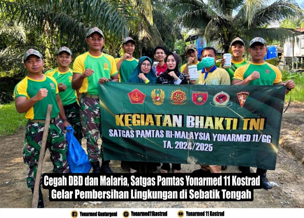 Nunukan, 30 April 2025 — Satgas Pamtas Yonarmed 11 Kostrad Pos Aji Kuning bersama Puskesmas Aji Kuning melaksanakan kegiatan Bhakti TNI berupa aksi pembersihan lingkungan di Desa Aji Kuning, Kecamatan Sebatik Tengah, Kabupaten Nunukan, sebagai langkah nyata dalam mencegah penyebaran penyakit Demam Berdarah Dengue (DBD) dan Malaria.