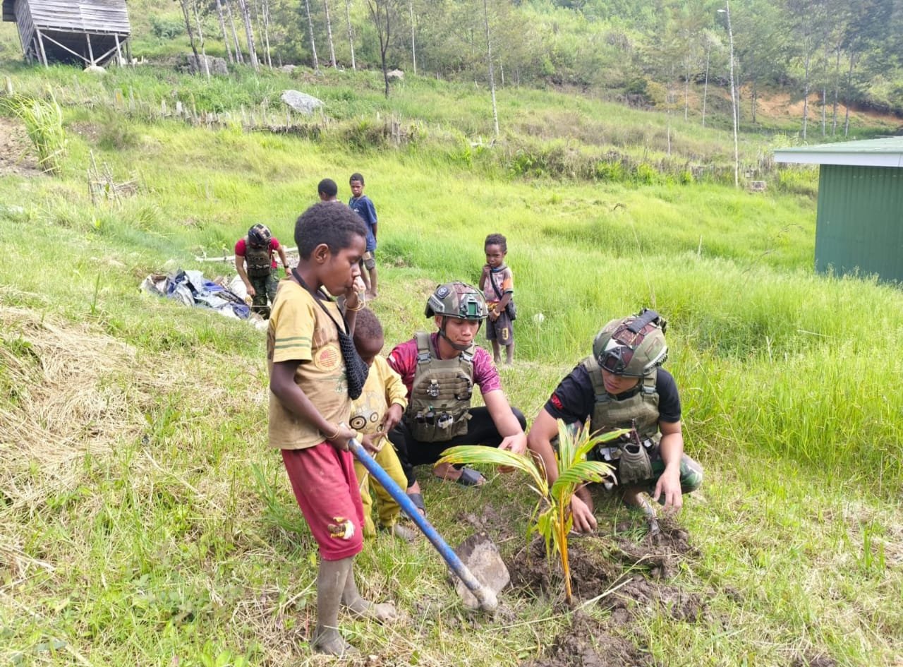 “Di Kabupaten Puncak ini, kami belum pernah melihat pohon kelapa tumbuh. Hari ini, kami menanam bersama masyarakat dengan penuh harapan agar kelak generasi penerus dapat merasakan dan menikmati hasil buah dari pohon kelapa ini.” ujar Lettu Inf I Made Mertiana, penuh semangat.