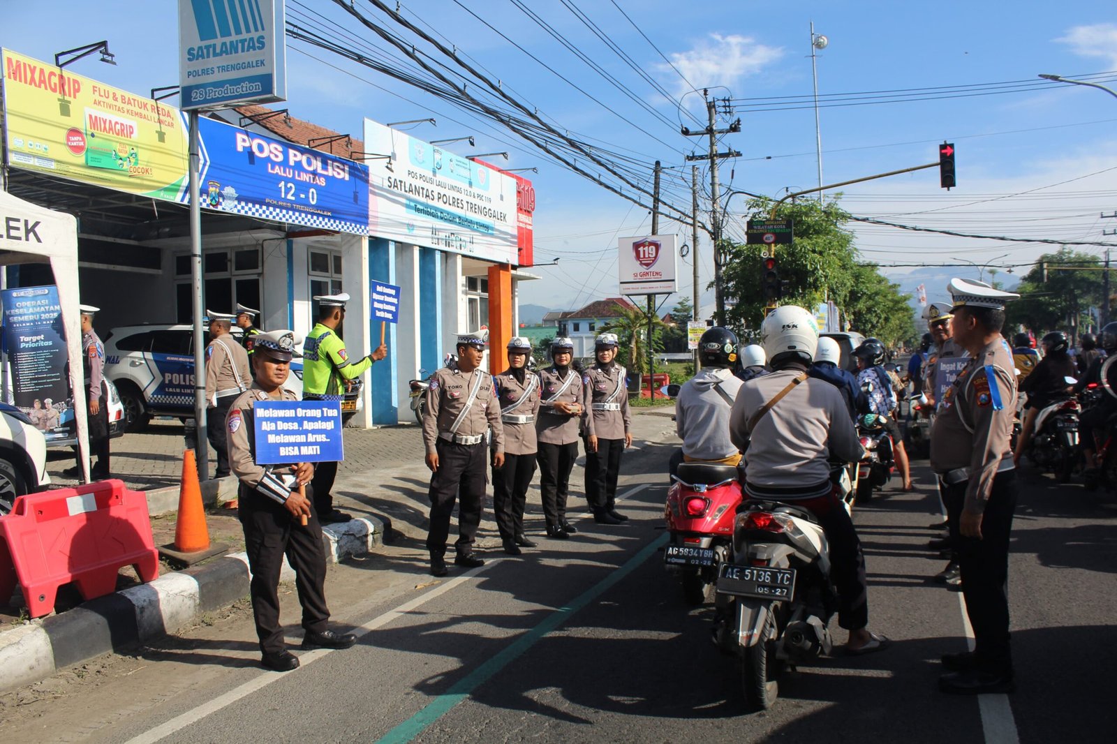 Sejumlah petugas dari Satlantas Polres Trenggalek Polda Jatim nampak membawa papan imbauan dengan kalimat unik.