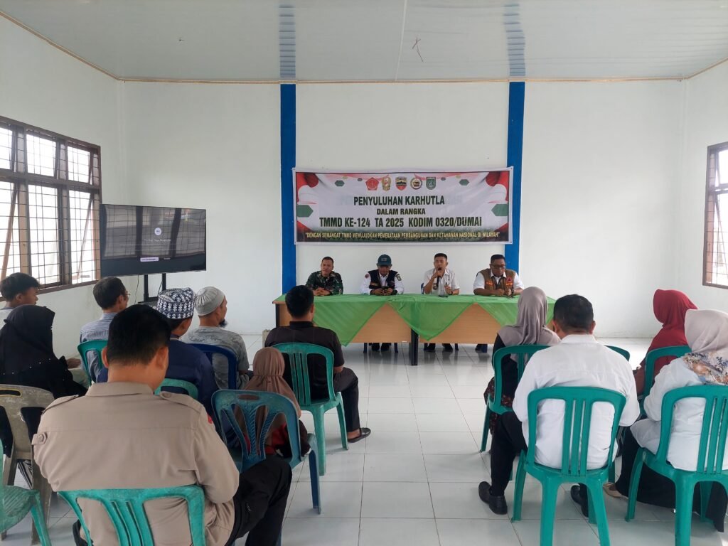 [ DUMAI, RIAU ] – Aula Kelurahan Bukit Kayu Kapur, Jumat (16/5/2025), dipenuhi antusiasme warga yang mengikuti kegiatan penyuluhan tentang Kebakaran Hutan dan Lahan (Karhutla). Acara ini merupakan bagian dari rangkaian kegiatan Tentara Manunggal Membangun Desa (TMMD) ke-124 yang diselenggarakan oleh Kodim 0320 Dumai.