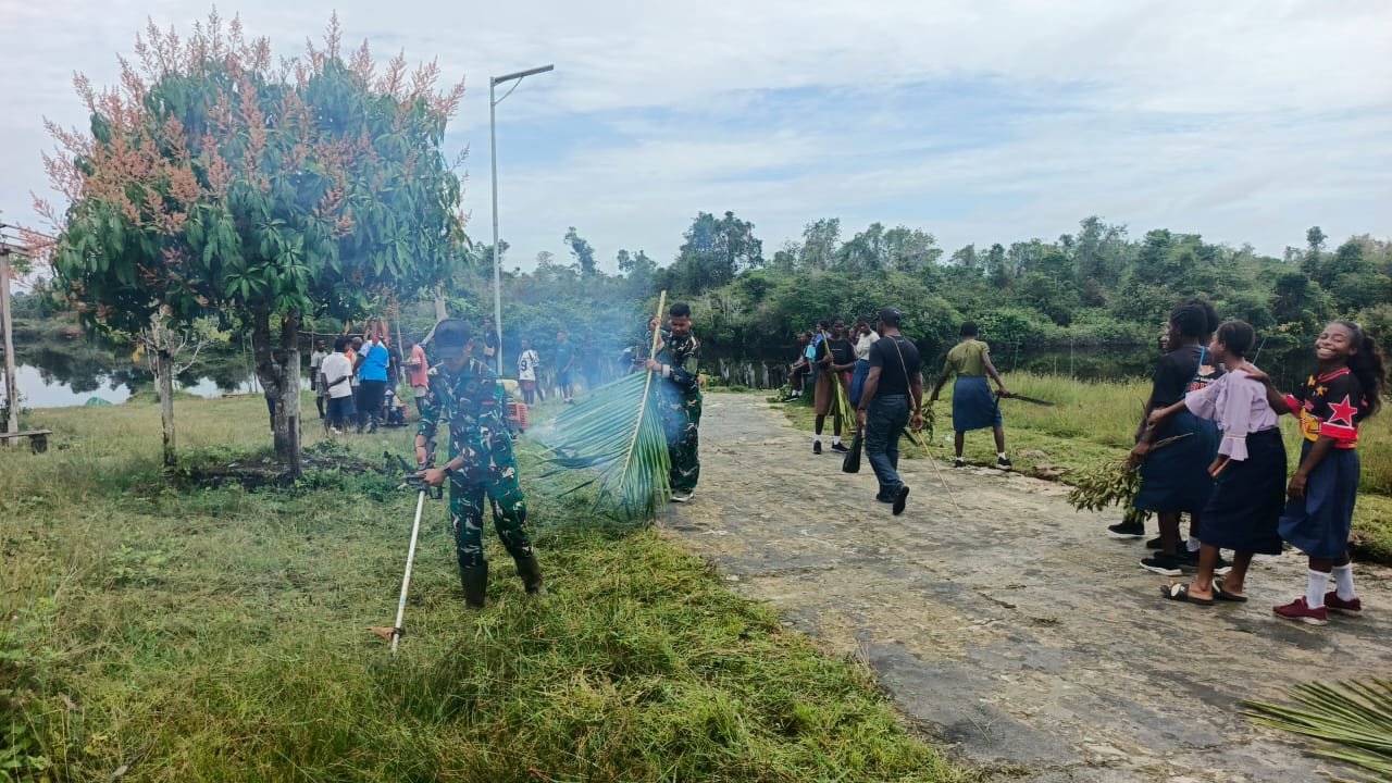 ‎Dalam kegiatan karya bakti kali ini, personel Pos Kaibar bersama warga Kampung Amazu bahu-membahu membersihkan lingkungan dan melakukan perbaikan infrastruktur dasar serta menjaga kebersihan lingkungan.