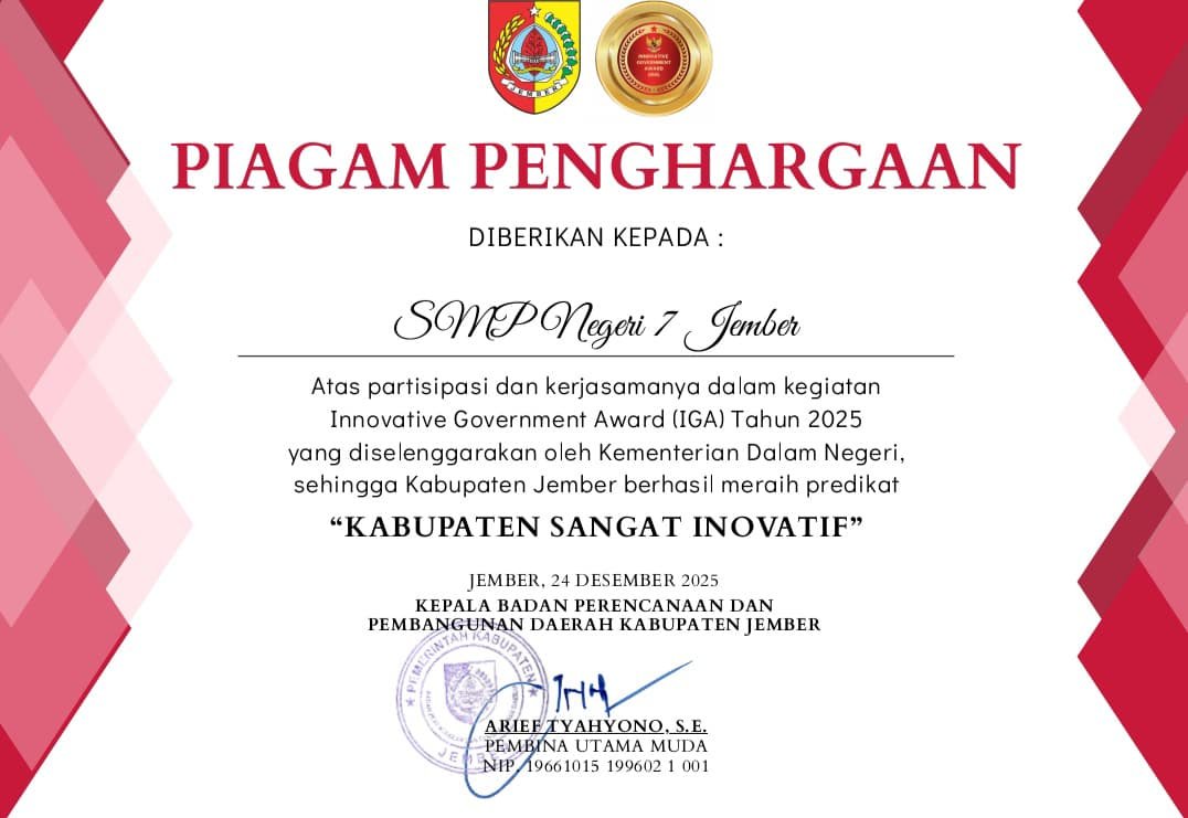 Jember – SMP Negeri 7 Jember kembali menorehkan prestasi membanggakan. Sekolah ini menerima Piagam Penghargaan Innovative Government Award (IGA) Tahun 2025 atas partisipasi dan kerja sama aktif dalam mendukung Kabupaten Jember meraih predikat “Kabupaten Sangat Inovatif” yang diselenggarakan oleh Kementerian Dalam Negeri Republik Indonesia.