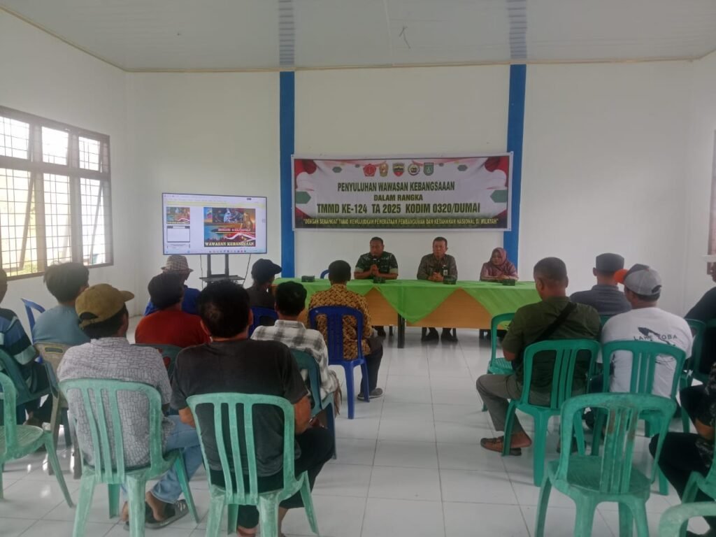[ KOTA DUMAI, 11/5/2025 ] – Program TNI Manunggal Membangun Desa (TMMD) ke – 124 Kodim 0320 Dumai di kelurahan bukit kayu kapur tidak hanya melaksanakan kegiatan yang bersifat fisik, Namun juga kegiatan non fisik berupa penyuluhan Wawasan Kebangsaan kepada masyarakat yang berada disekitar lokasi TMMD digelar di Aula Kelurahan Bukit Kayu Kapur.